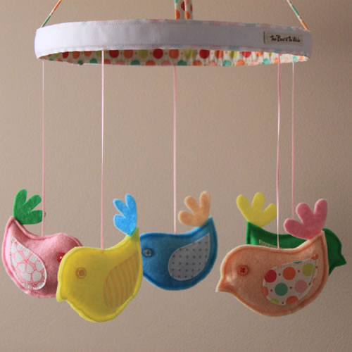 I was filling an order yesterday for a pastel birds mobile and gave the old design a freshen up with bright new fabrics and a cute little tail feather.