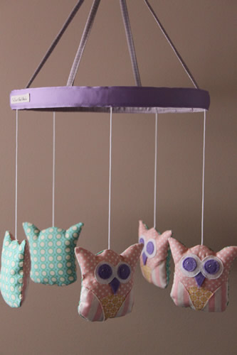 I loved making another custom order this week for a lady who wanted my owls mobile in pastel tones and including the colours turquoise, lilac, baby pink, lemon and white, with a purple ring at the top.