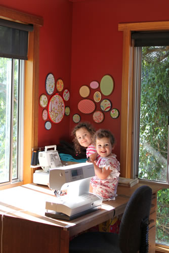 Seeing me sitting up on the sewing desk as I hung the hoops, Elsie and Maeve just had to hop up too. Plus it was a novelty that there were no more piles of fabric, loose buttons, odd bits of that fusible interfacing paper that may or may not still have the interfacing on there (hard to tell), receipts, tape measures, pins and handy sized shoe boxes that you might use for something (you’re just not sure what).