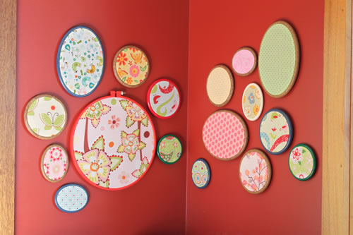 And in just 15 minutes or so, I’d made some art for the walls in my corner. I’d seen this idea on websites and initially didn’t like it, but when, during my tidy up, I came across a bag full of all these embroidery hoops given to us by an old great aunt (during her tidy up), I decided I’d go with the embroidery hoop wall art – perfect for a sewing corner, don’t you think?