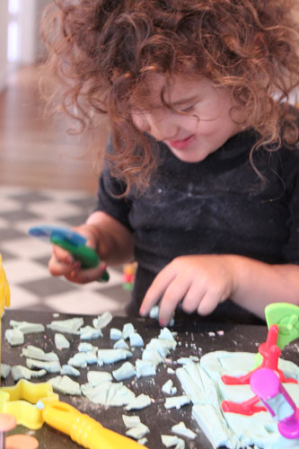 ‘Let’s make some really cool play dough,’ I suggested. So we mixed one part hair conditioner with two parts cornflour; a recipe I’d seen somewhere on the web. (And when the cornflour was all gone and the play dough was too sticky, I used arrowroot. Why did I have a box of arrowroot? What do you use arrowroot for anyway? And when the mysterious box of arrowroot was empty and the play dough was still too sticky, we used custard powder. And when the custard powder was all gone, I said, ‘There. It’s perfect.’)