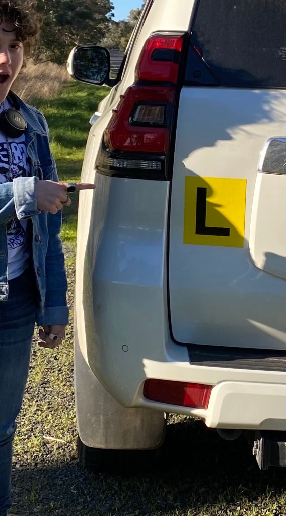 Today, she has shown her 16yo birth certificate to a VicRoads customer service officer and been handed a learner’s permit in return. We scout the shops for L plates and find a set in the second shop we try.
